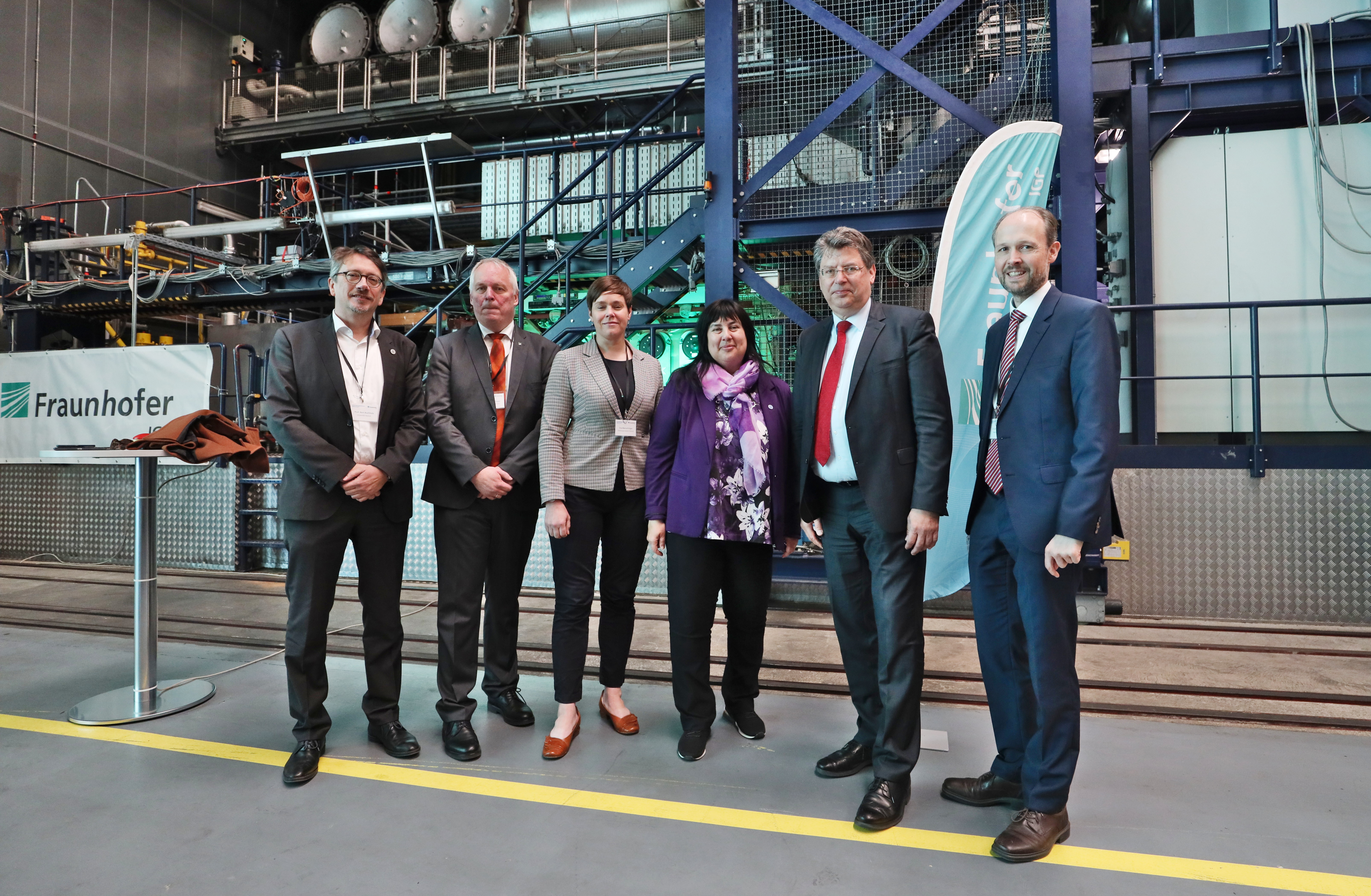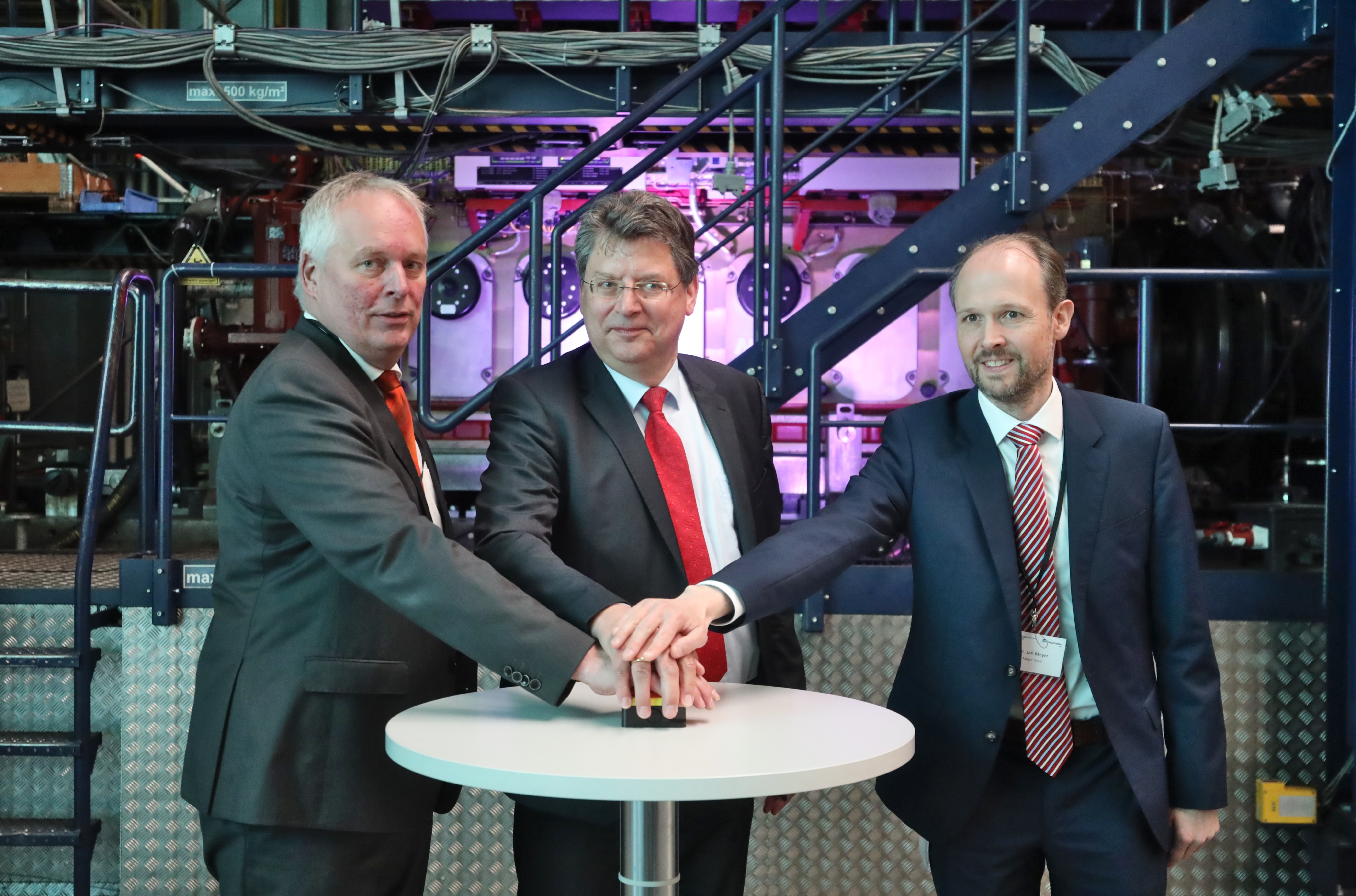 Mit dem symbolischen Start eines Großmotors per Knopfdruck beschlossen Prof. Wilko Flügge, Leiter des Fraunhofer IGP, Wirtschaftsminister Meyer und Dr. Jan Meyer den Festakt.