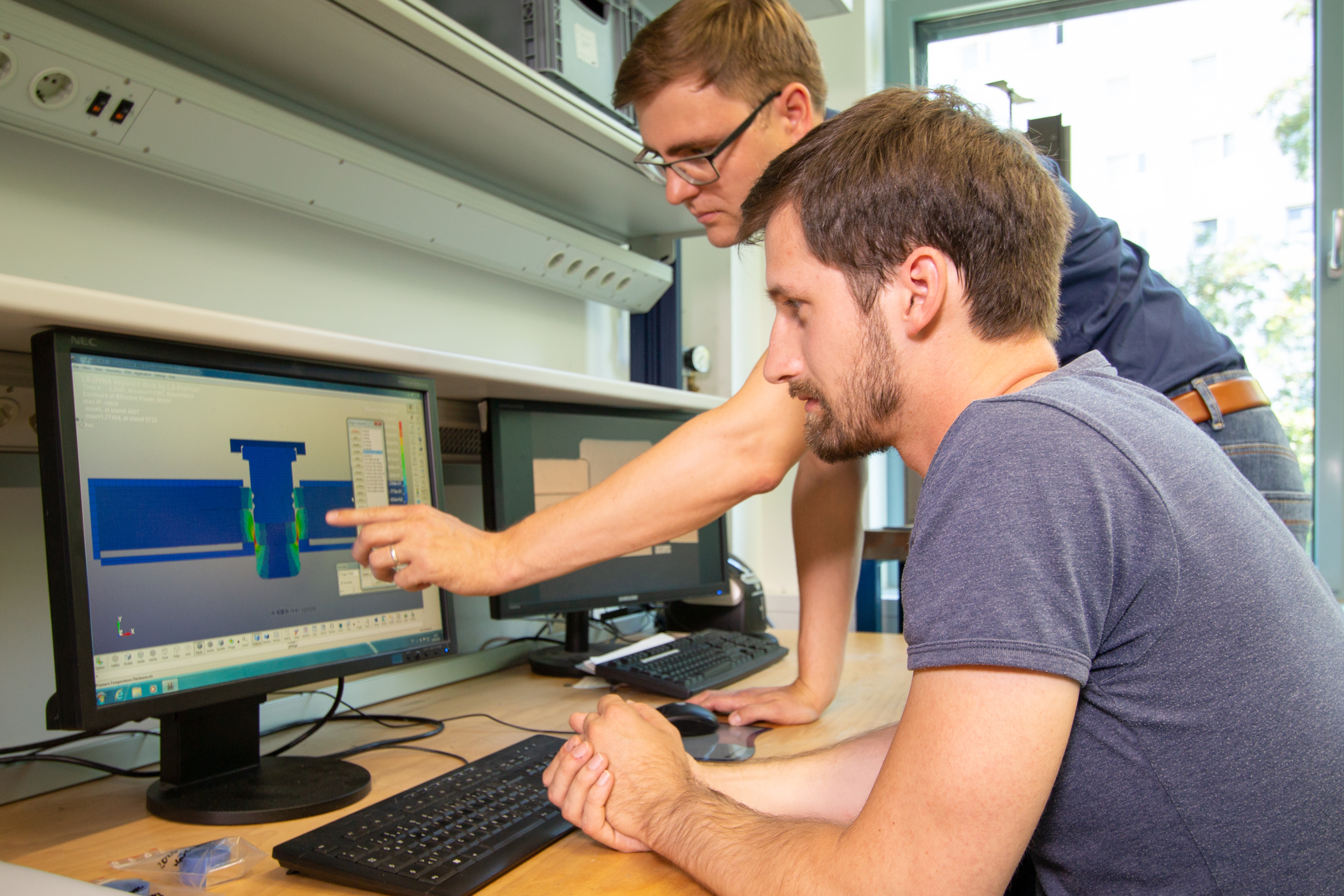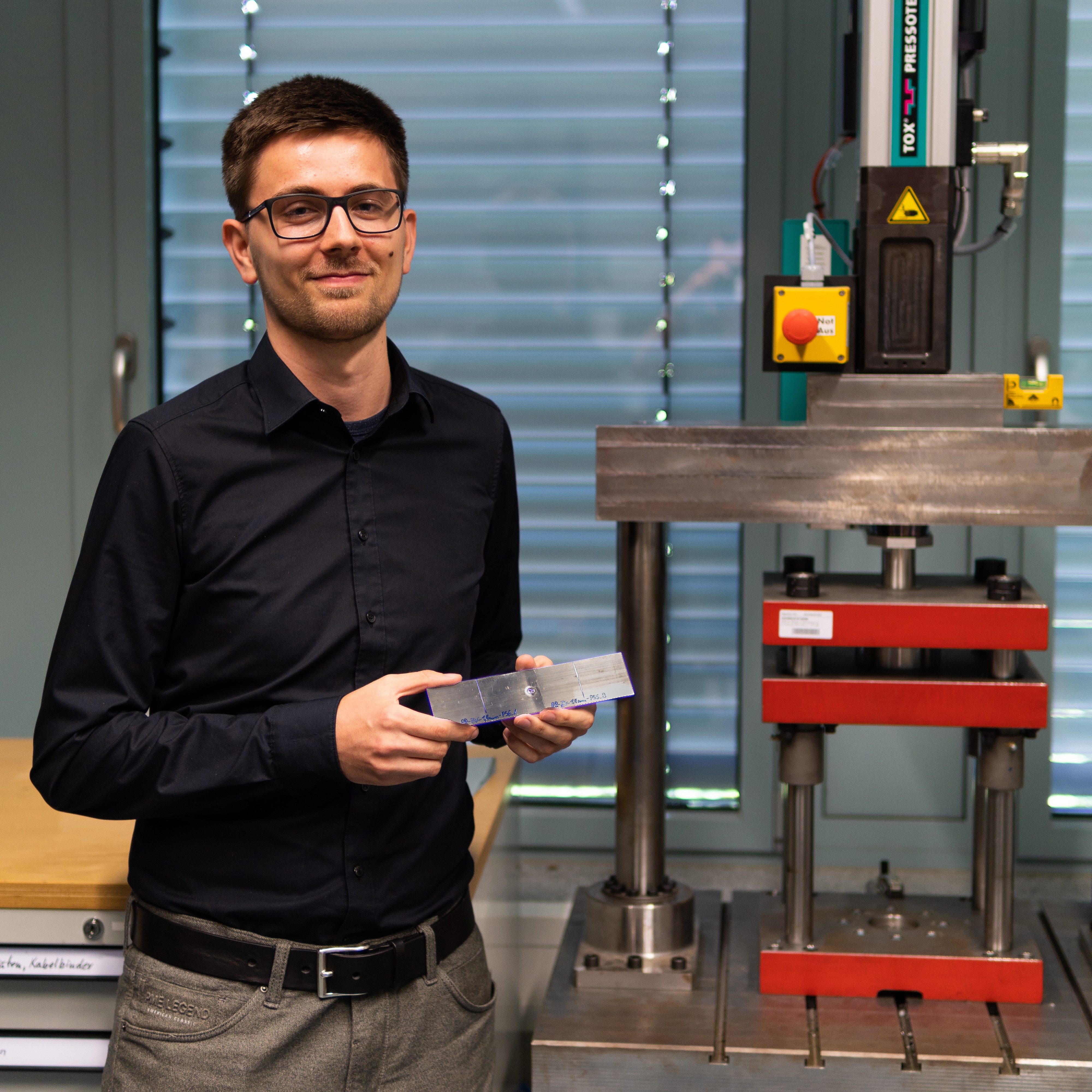 In der Folge schrieb Max auch seine Studienarbeit und seine Masterarbeit am Fraunhofer IGP. Thema der Arbeit: »Numerische Simulation des Installationsprozesses von Vollstanznieten mit variierenden Geometrie- und Werkstoffkonzepten“. Die schrieb er mit ein paar Wochen weniger Zeitpolster als vorgesehen. Denn er brauchte genug Zeit, um sich auf eine ausgeschriebene Doktorandenstelle zu bewerben, die ab 1. Januar 2019 besetzt werden sollte. »Ich habe meine Arbeit Ende November 2018 verteidigt, und dann musste ich schnell eine Bewerbung schreiben.« Er bekam den Job.
