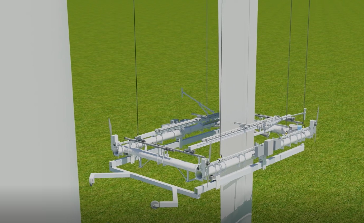Eine Winde am Boden und auf der Plattform installierte Propeller, ausfahrbare Beine sowie eine Einspannvorrichtung ermöglichen ein sicheres Manövrieren und Positionieren der Plattform an der Windenergieanlage und am Rotorblatt.