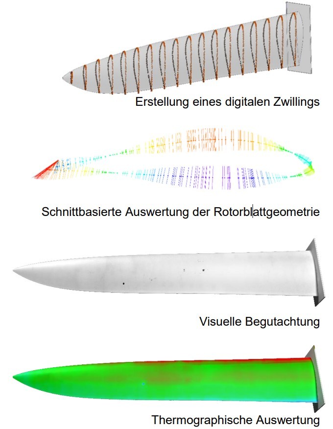 Die von den Sensoren aufgenommenen Daten werden in einem Softwaretool aufbereitet und in Form eines digitalen Zwillings als texturiertes 3D-Modell des Flügels zur Verfügung gestellt. Dies erleichtert die Fehleranalyse und Dokumentation der Rotorblätter und ermöglicht den Prüfingenieur*innen eine Inspektion vom Bildschirmarbeitsplatz.