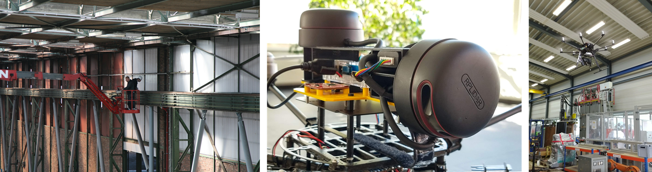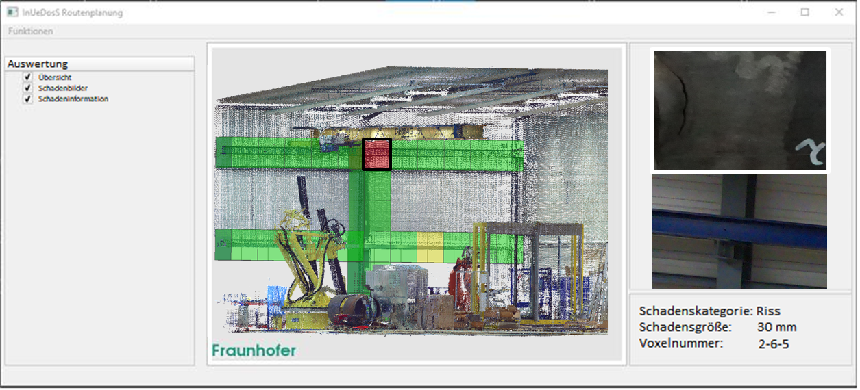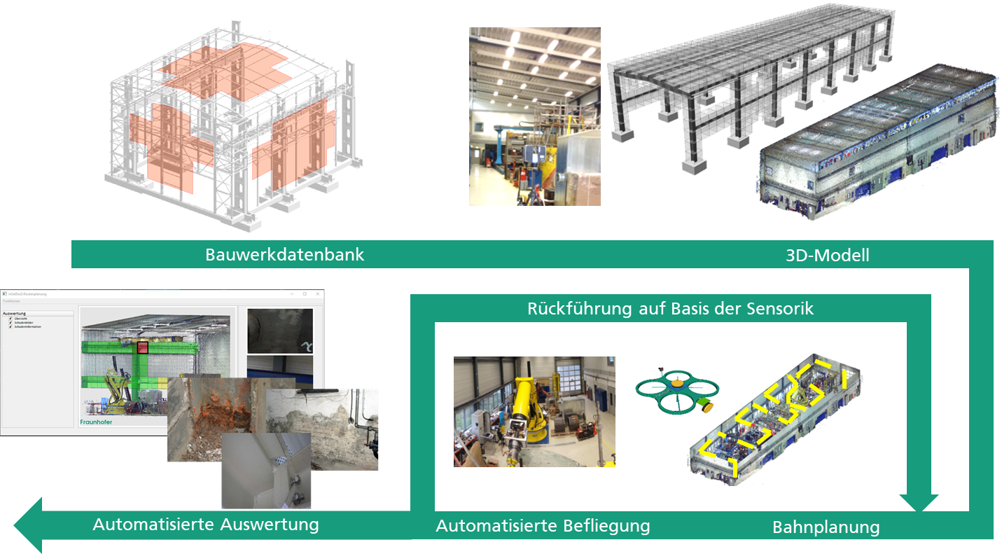 Die Erfassung des Zustandes während der Bauwerksprüfung soll ohne handnahe Vor-Ort Präsenz möglich sein. Als Lösung wurde ein Inspektionssystem auf Basis automatisiert agierender unbemannter Flugobjekte entwickelt. Dafür wird das Bauwerk im ersten Schritt mit einem Laserscanner erfasst. Auf Basis der 3D-Aufnahme erfolgt anschließend die automatisierte Bahnplanung sowie Befliegung des Bauwerkes. Die Herausforderung bei der Befliegung besteht in der Navigation des UAV. Während im Außenbereich globale Positioniersysteme (z.B. GPS) genutzt werden können, muss im Innenbereich die Navigation und Kollisionskontrolle anhand von Bauwerkswissen in Verbindung mit Sensoren realisiert werden. Bei der autonomen Befliegung erfolgt die bildbasierte Dokumentation der für die Bauwerksprüfung relevanten Bereiche (z.B. Fügestellen). Anschließend wird aus den erfassten visuellen 2D- und 3D-Daten ein 3D-Modell als Grundlage für die bautechnische Inspektion erstellt. Anhand dieses Modells erfolgt eine automatische Analyse und Klassifikation der Schäden. Daraus wird eine Bewertung des Bauwerkzustands anhand geltender Richtlinien abgeleitet. Durch die Entwicklungen ergibt sich die Möglichkeit automatisiert Ingenieursbauwerke sowie Hallenstrukturen wirtschaftlich zu prüfen und so sicherheitsrelevante Veränderungen frühzeitig zu erkennen. Es lässt sich ein nachhaltiges Bauwerksmanagement realisieren, womit die Instandhaltungskosten reduziert und durch die dokumentierten Sicherheitsstandards das Haftungsrisiko gesenkt werden können.